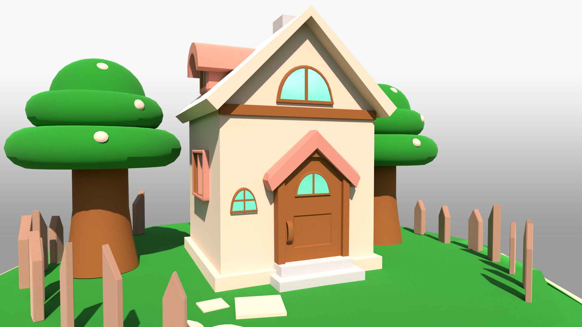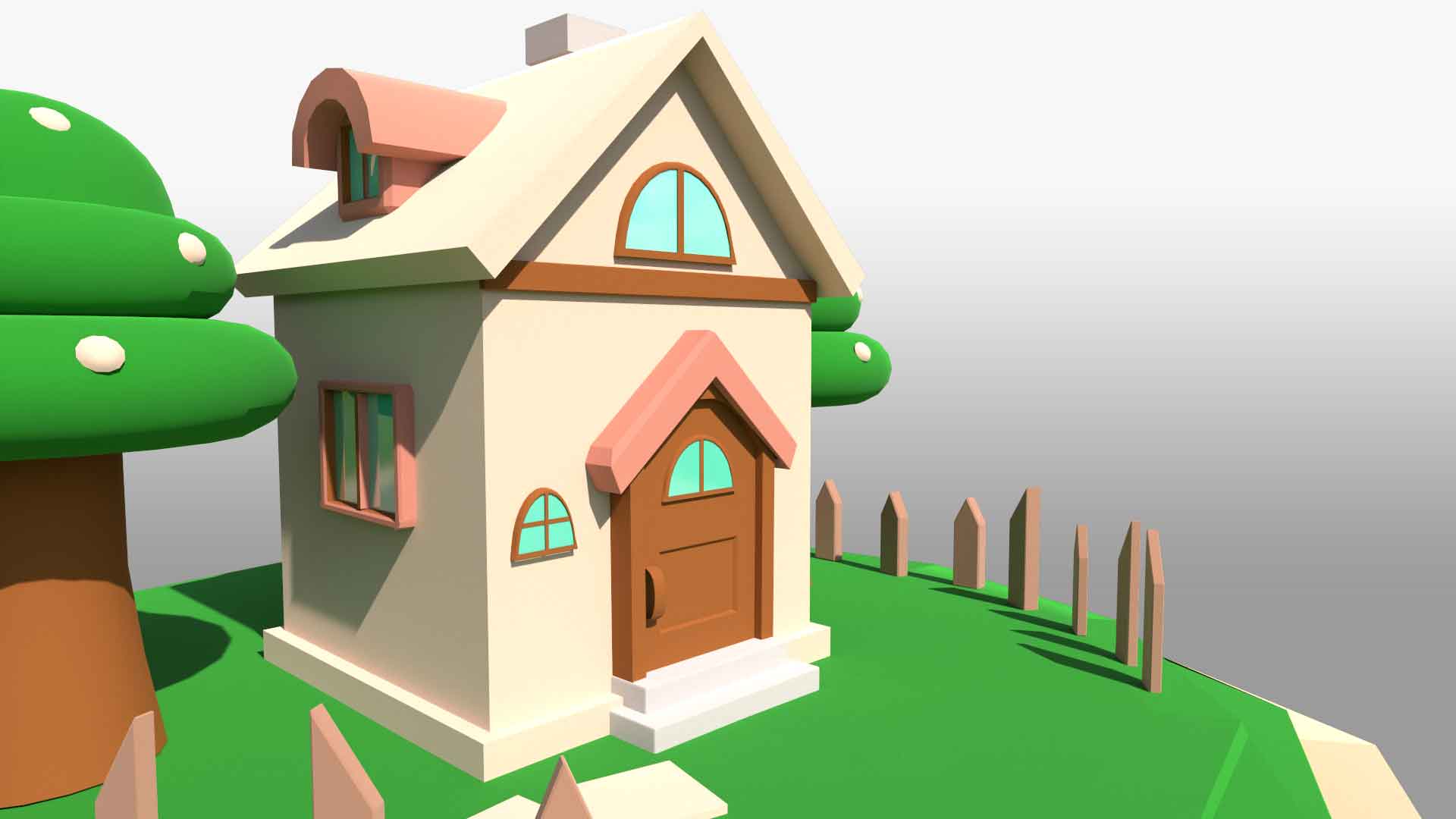 This 3D model of a cartoonish low poly house environment is created using Autodesk Maya. The model features a cozy, low poly house with geometric shapes, including an asymmetrical roof, front door, windows, and a chimney. Surrounding the house is a playful, low-poly environment with a green lawn and stylized trees. A stone path leads to the house, with a charming picket fence completing the scene.