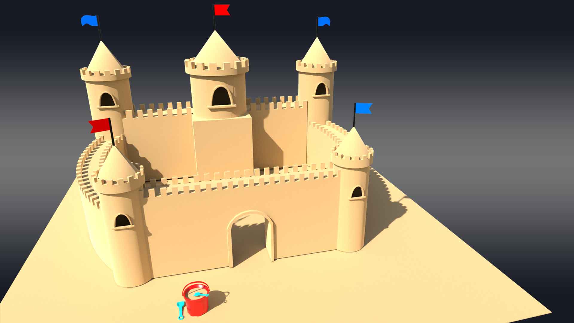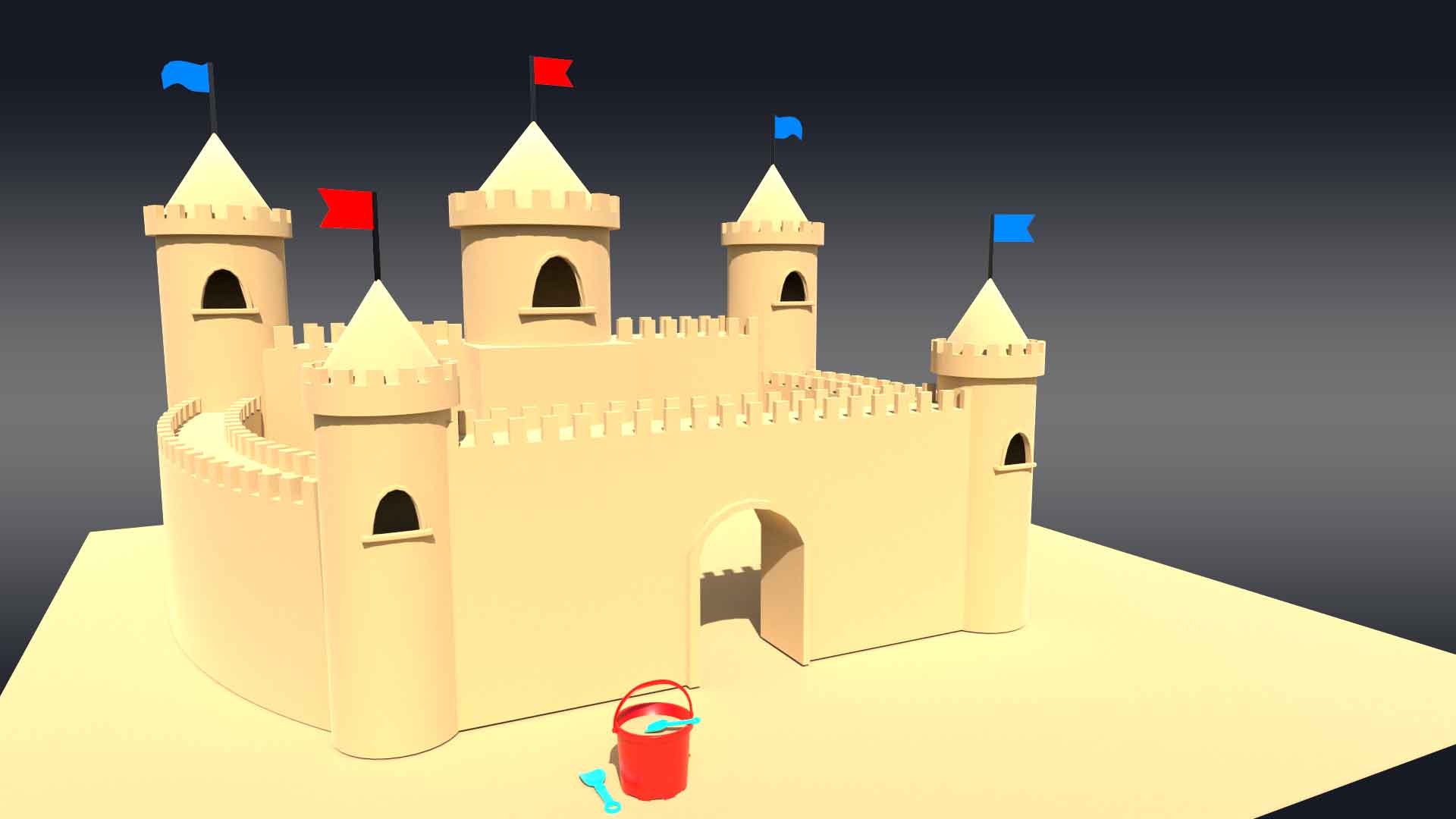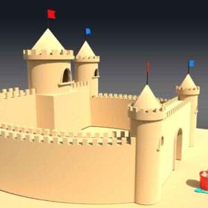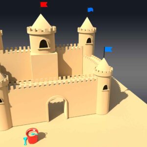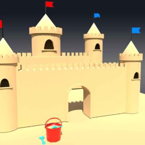 This 3D model features a low poly castle created with Autodesk Maya. It uses clean and simple shapes for a playful, stylized look. The low poly castle is designed as a sandcastle, perfect for beach scene models. It includes square walls, blocky turrets, and sharp corners. Each part is modeled with a minimal, geometric style to support real-time rendering. A small bucket and shovel sit beside the castle, matching the same low poly design.