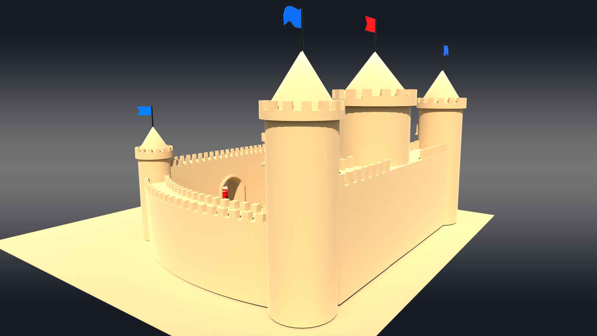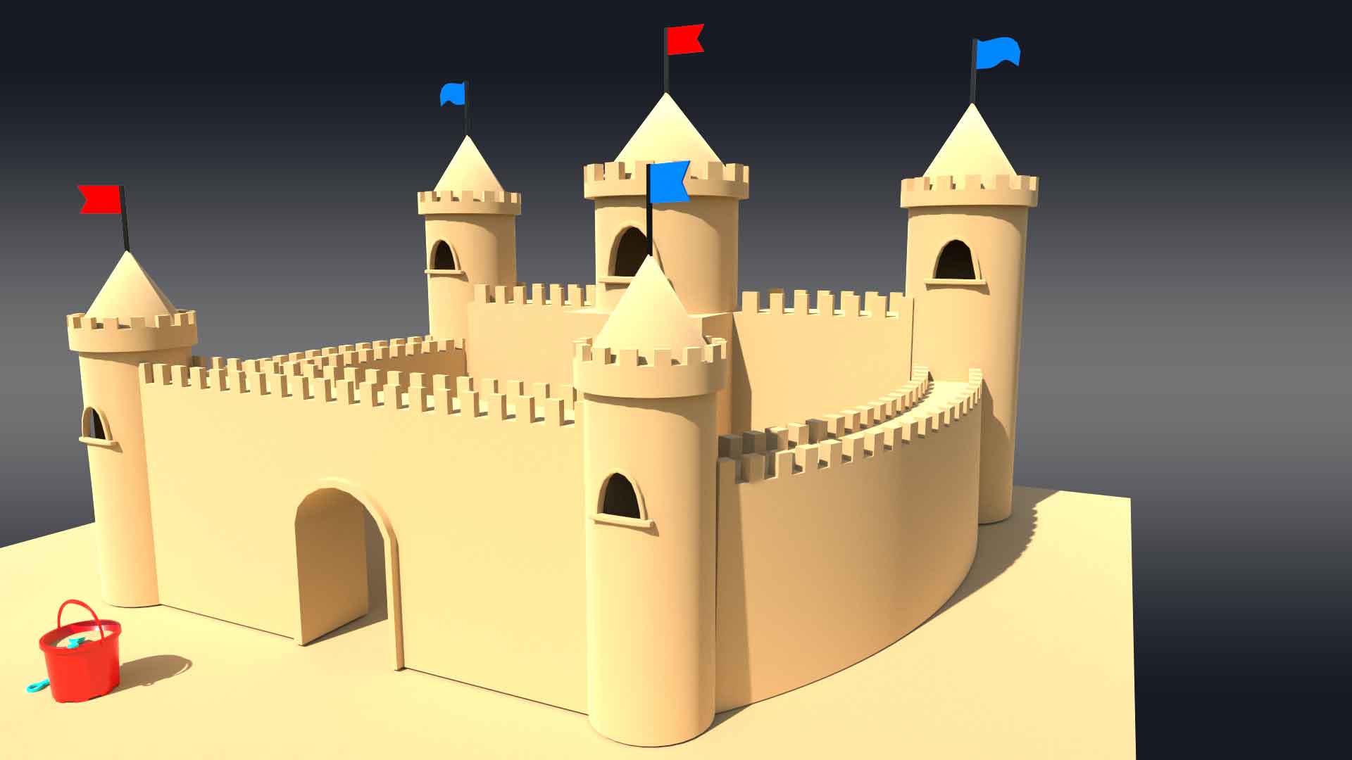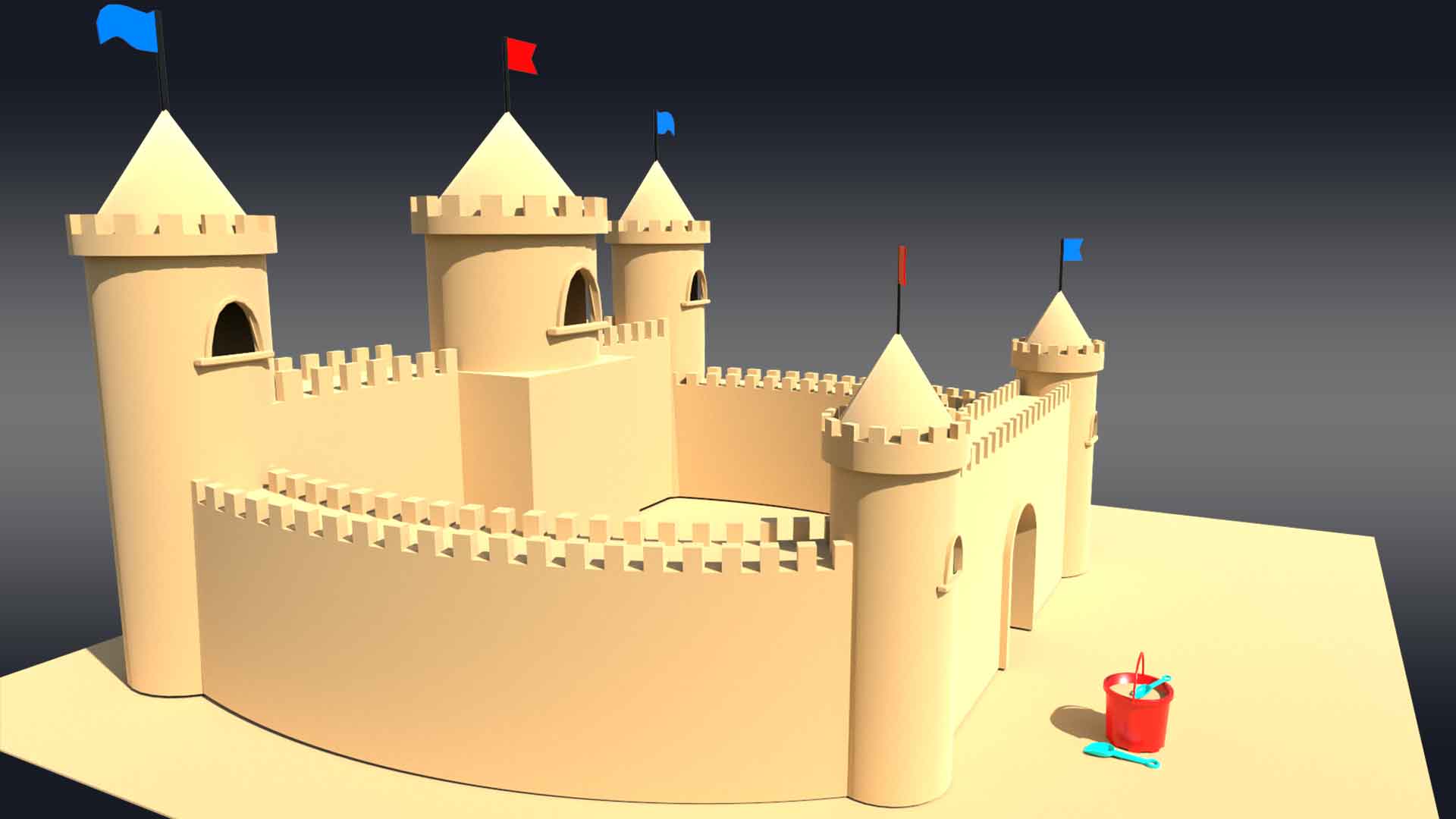 This 3D model features a low poly castle created with Autodesk Maya. It uses clean and simple shapes for a playful, stylized look. The low poly castle is designed as a sandcastle, perfect for beach scene models. It includes square walls, blocky turrets, and sharp corners. Each part is modeled with a minimal, geometric style to support real-time rendering. A small bucket and shovel sit beside the castle, matching the same low poly design.