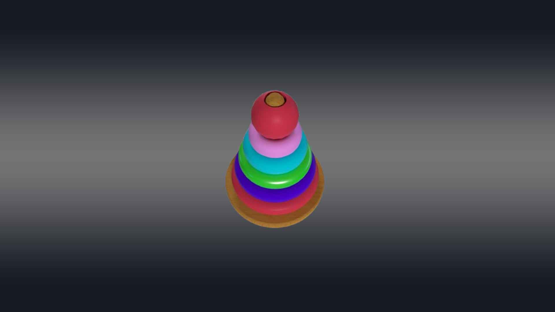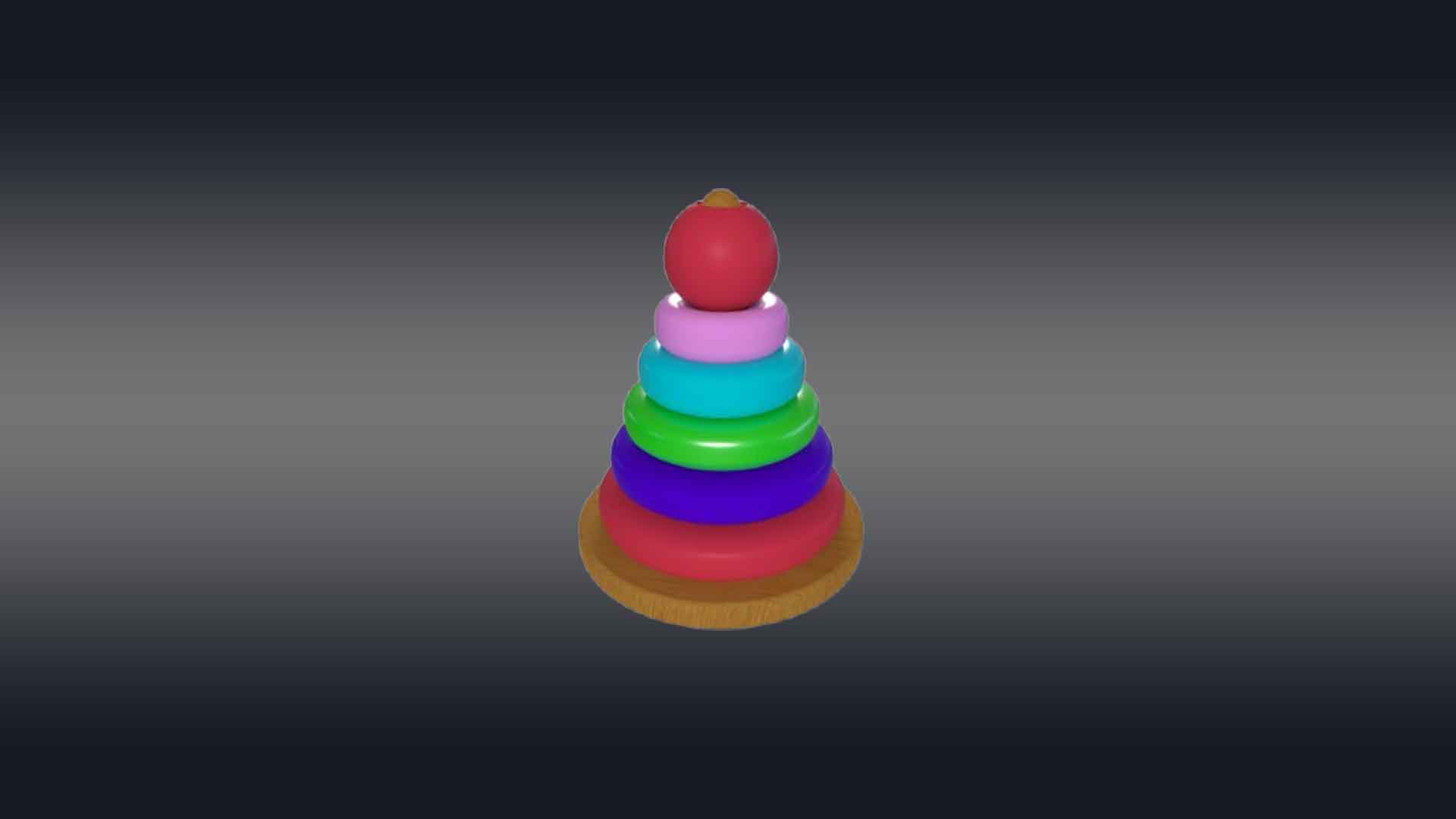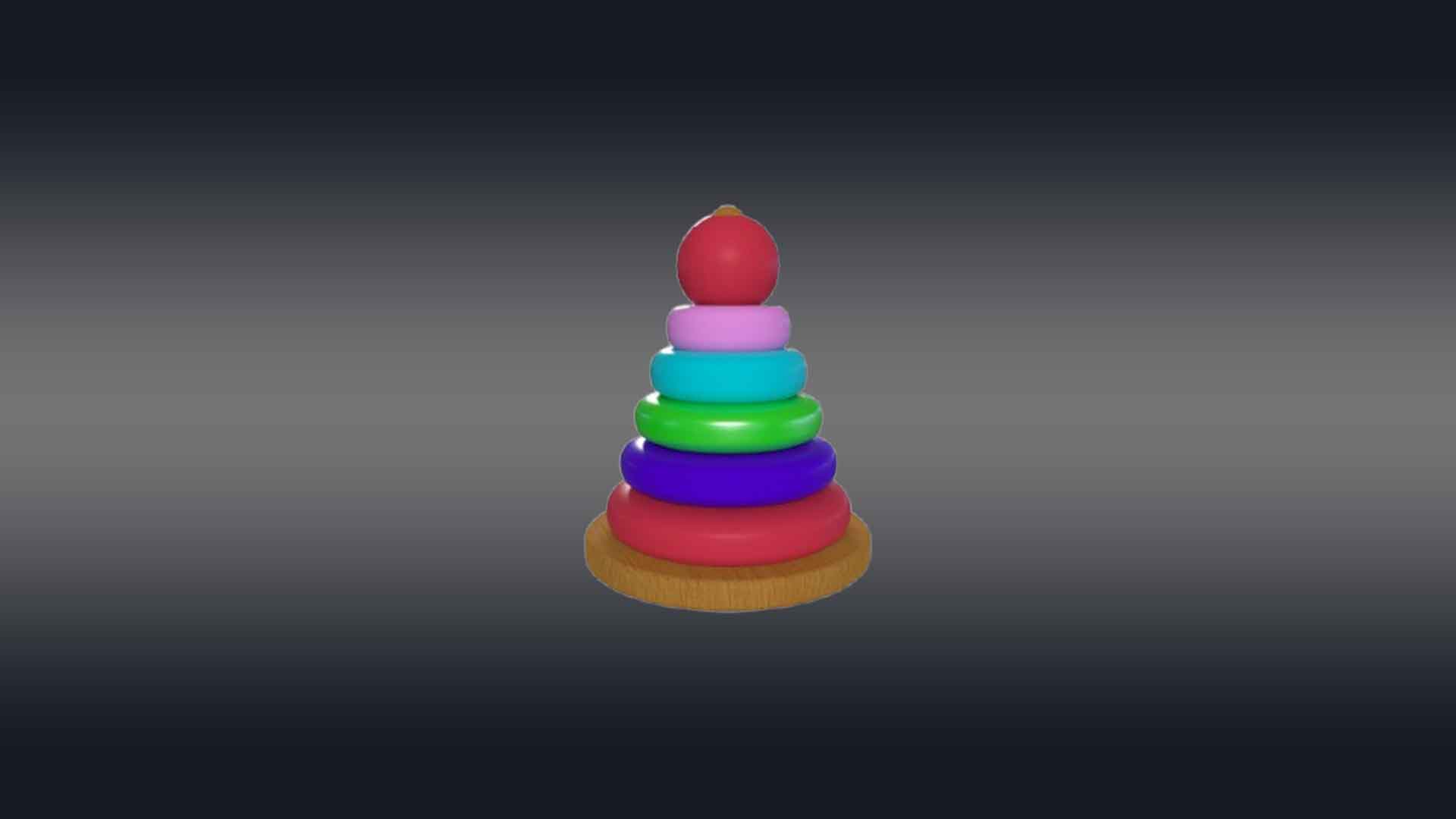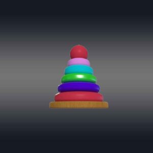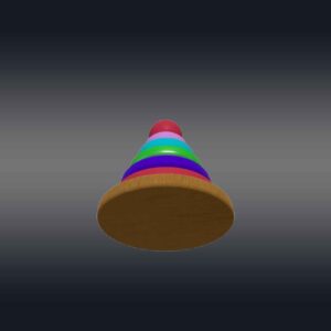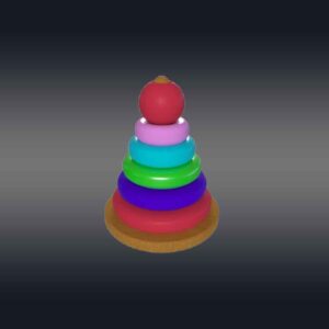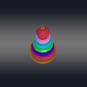 This 3D rainbow tower toy has a cone-shaped central peg mounted on a sturdy circular base, with a series of colorful rings in decreasing sizes. Each ring is a vibrant color of the rainbow—red, green, blue, aqua, and violet—creating an eye-catching gradient. The base and peg are made of smooth, polished wood. The rings are slightly rounded with smooth textures to prevent sharp edges. The toy is perfect for 3d videos made for toddlers to teach them hand-eye coordination, sorting, and size recognition. This design is both engaging and educational, ideal for playroom videos or VR and AR.