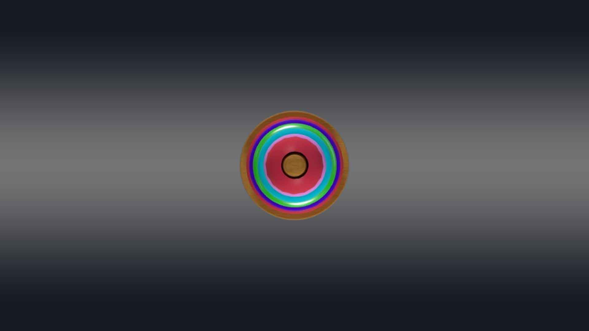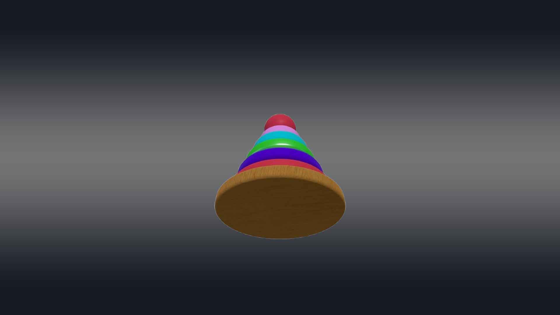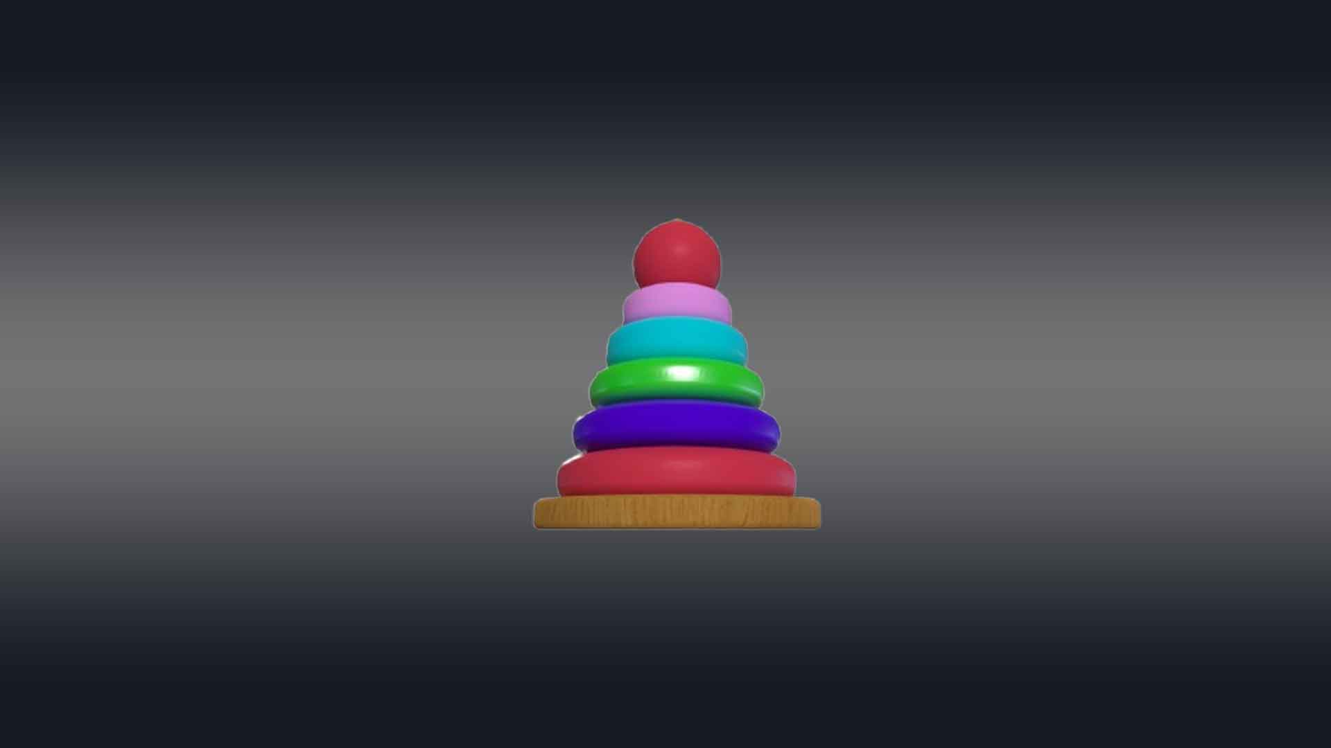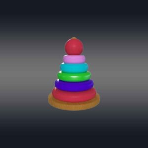 This 3D rainbow tower toy has a cone-shaped central peg mounted on a sturdy circular base, with a series of colorful rings in decreasing sizes. Each ring is a vibrant color of the rainbow—red, green, blue, aqua, and violet—creating an eye-catching gradient. The base and peg are made of smooth, polished wood. The rings are slightly rounded with smooth textures to prevent sharp edges. The toy is perfect for 3d videos made for toddlers to teach them hand-eye coordination, sorting, and size recognition. This design is both engaging and educational, ideal for playroom videos or VR and AR.
